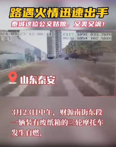 3月23日中午,財源南街東段一輛裝有廢紙箱的三輪摩托車發(fā)生自燃,千鈞一發(fā)之際,泰安公交第一分公司10路線駕駛員張南南拎起滅火器奔向自燃的車輛,迅速將火情控制并撲滅,得到乘客和路人的一致稱贊。