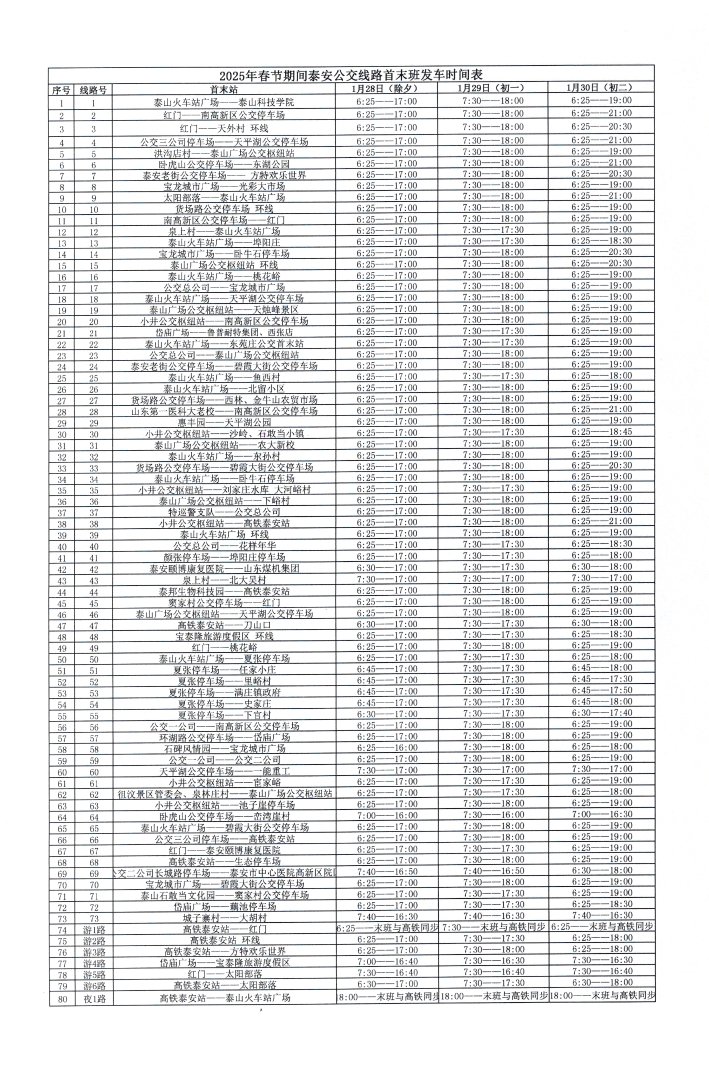 為切實(shí)保障好春節(jié)期間市民出行,泰安市公共交通有限公司結(jié)合市民節(jié)日出行規(guī)律和變化,統(tǒng)籌考慮安排公交線(xiàn)路首末班發(fā)車(chē)時(shí)間,1月28日、29日(除夕、初一)將對(duì)所屬營(yíng)運(yùn)線(xiàn)路發(fā)車(chē)間隔、首末班時(shí)間等作出調(diào)整(具體情況見(jiàn)附表)。
